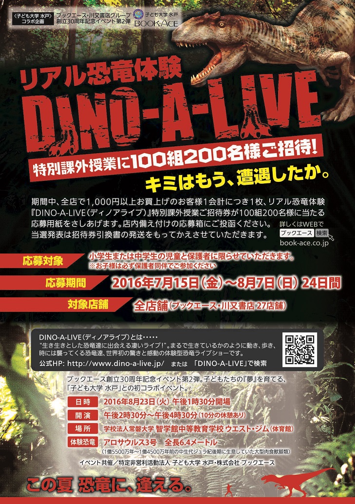 なお、今回の特別課外は「ブックエース・川又書店さま」との共催となります。すでに店舗に行かれた方はご存知かもしれませんが、書店内で1,000円以上お買い上げの方には応募券がもらえ、DINO-A-LIVEの申し込みが出来るシステムです。夏の課題図書などを購入して頂き、ご応募をしてください。