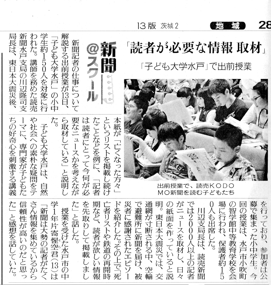 10月13日(土)に実施した子ども大学水戸第4回講義の様子が、10月14日付の「読売新聞」掲載されました!