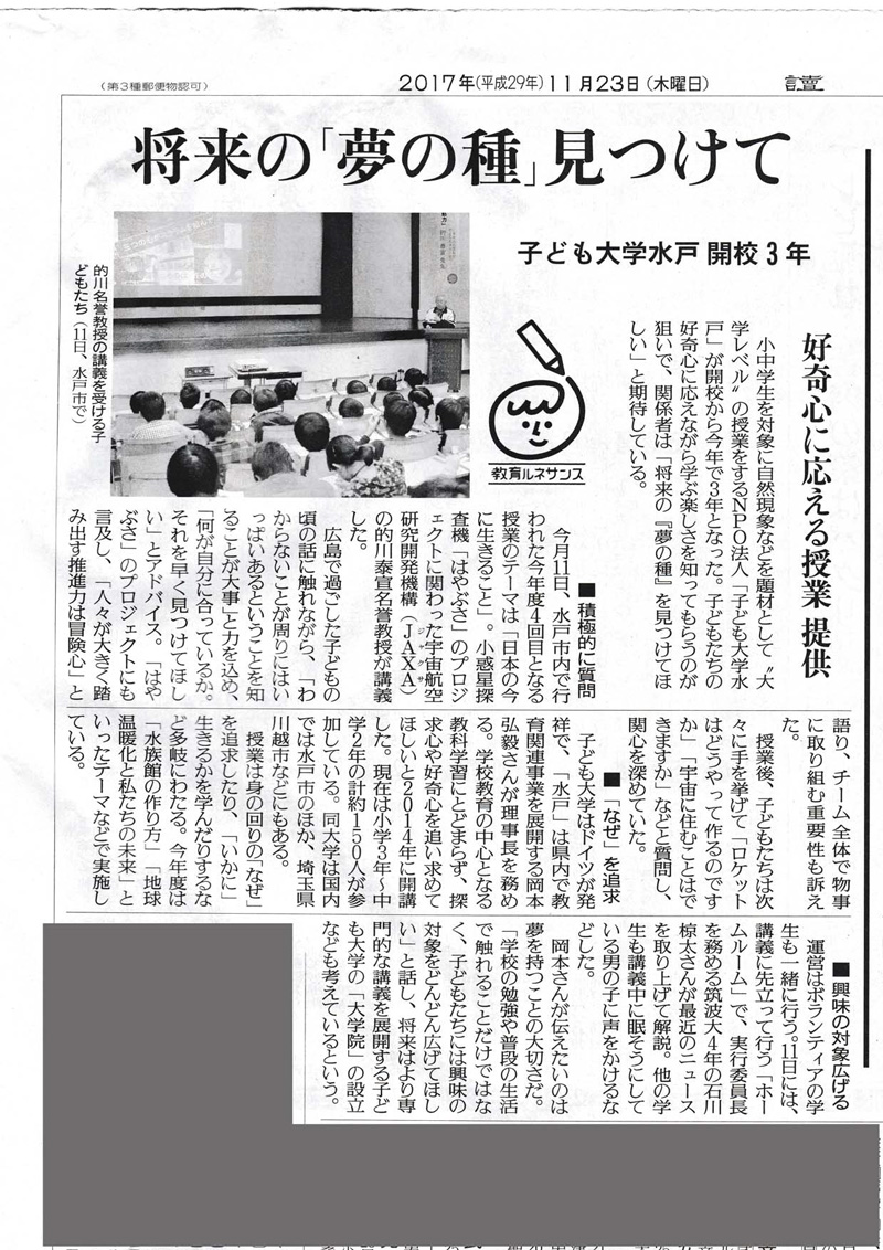 子ども大学水戸も開学から4期目となりましたが、丸3年が経過したということで、読売新聞に掲載されました。